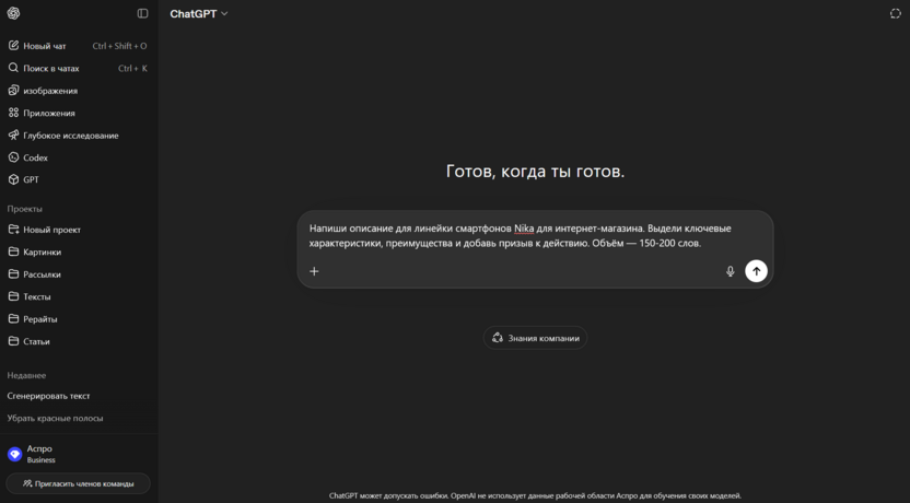 ChatGPT подходит, если нужно быстро подготовить текст и протестировать гипотезы без команды копирайтеров.