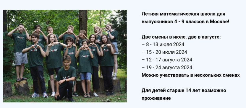 Летний математический лагерь в Москве «Олмат» – это математическая программа для школьников, которые хотят глубже погрузиться в мир олимпиадной математики и развить свои интеллектуальные способности. Занятия проходят в дневном формате на базе учебного центра в Москве, без проживания.