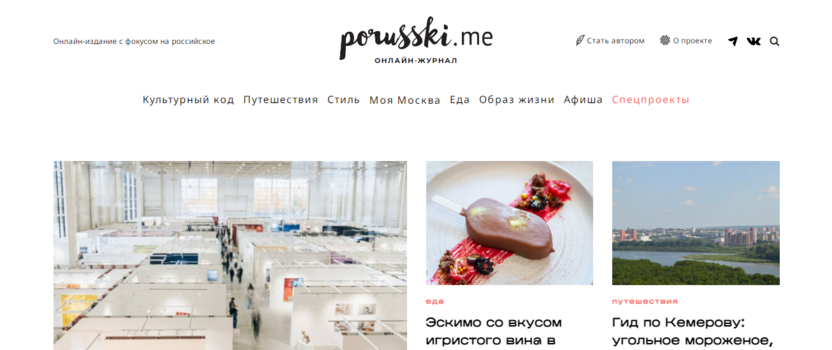 Онлайн-журнал с материалами о путешествиях по России и странам СНГ, еде, фотографии, стиле, дизайне, трендах и ярких людях. Главное – любой рассказ должен быть живым и увлекательным. Если хотите присоединиться, напишите на do@porusski.me, но сначала загляните в руководство для авторов.