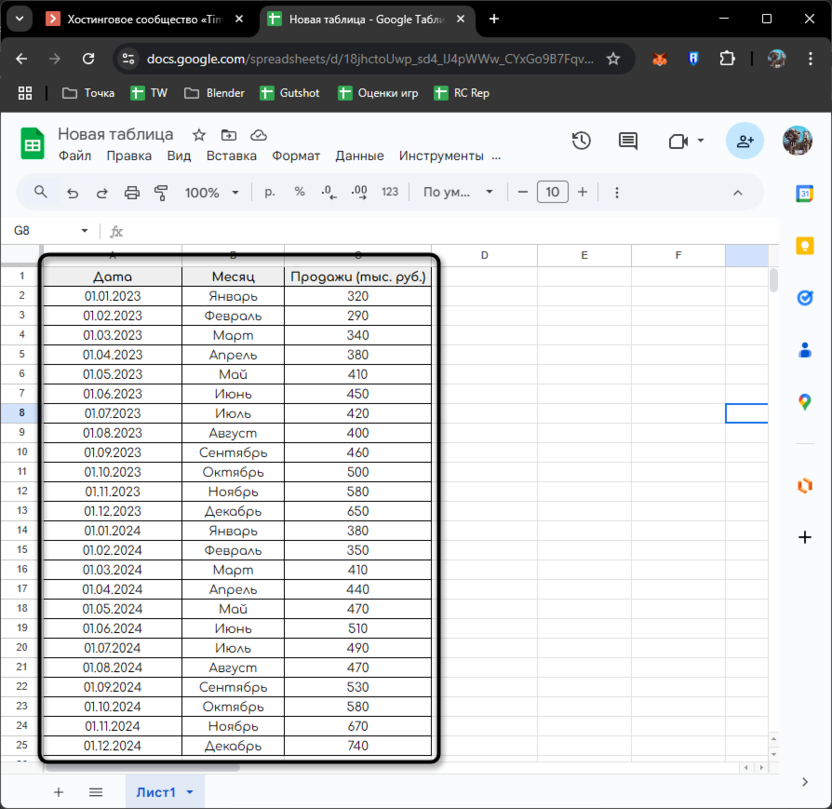 Для нашего анализа давайте создадим таблицу с ежемесячными продажами интернет-магазина за два года. Эти данные помогут нам продемонстрировать различные методы анализа временных рядов и выявления закономерностей.