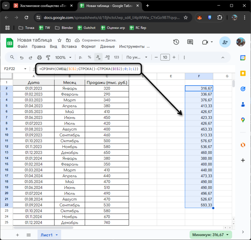 Эта формула размещается в столбце F начиная с ячейки F2 и копируется вниз. Она автоматически рассчитывает трехмесячное скользящее среднее для каждого периода.