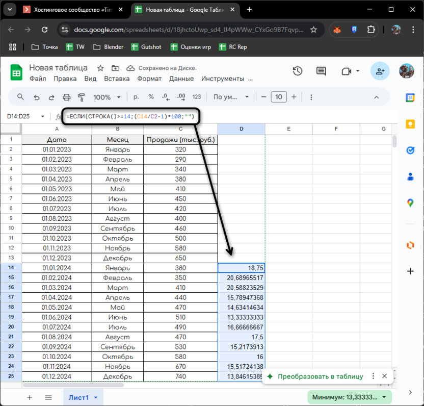 Эта формула размещается в ячейке D14 (январь 2024) и сравнивает продажи с январем 2023. Копируя ее вниз, получаем процентное изменение для каждого месяца. Параметр ЕСЛИ проверяет, что мы находимся в данных за 2024 год, чтобы избежать ошибок при попытке сравнения данных 2023 года с несуществующими значениями 2022 года.