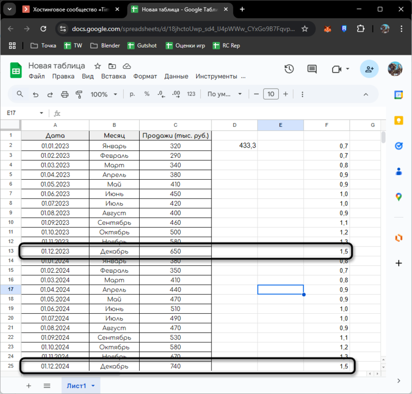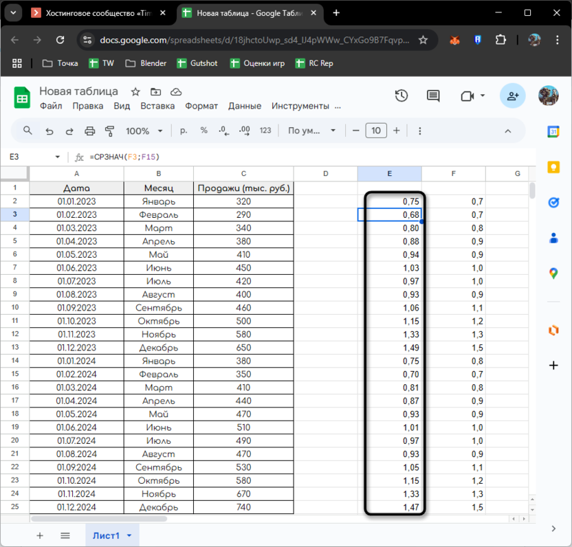 Эта формула, размещенная, например, в ячейке E2, вычисляет средний индекс января на основе индексов января 2023 и 2024 годов. Аналогично рассчитываем индексы для других месяцев.
