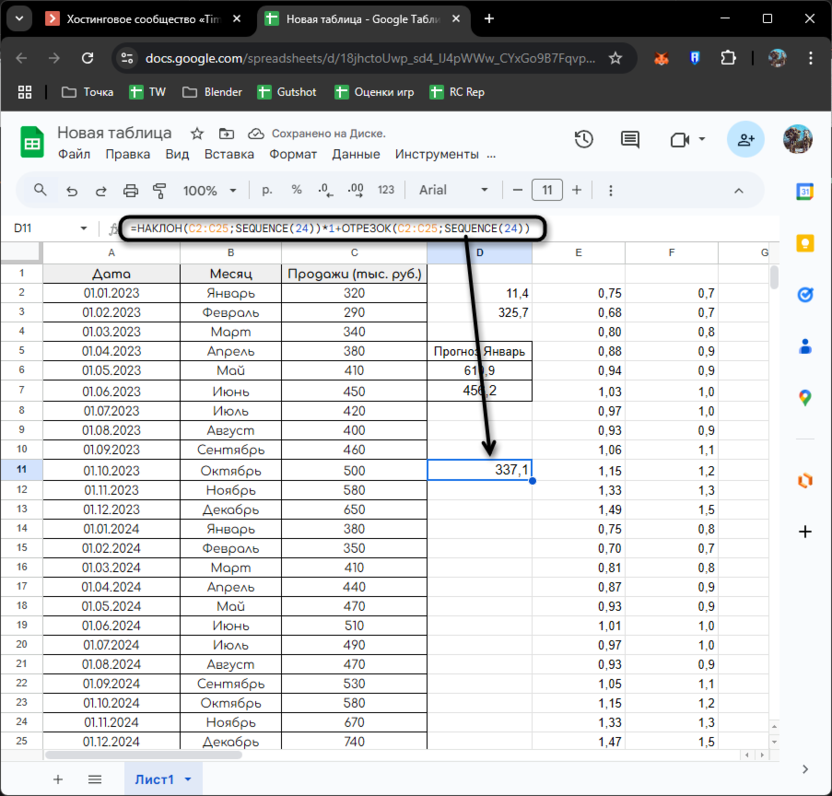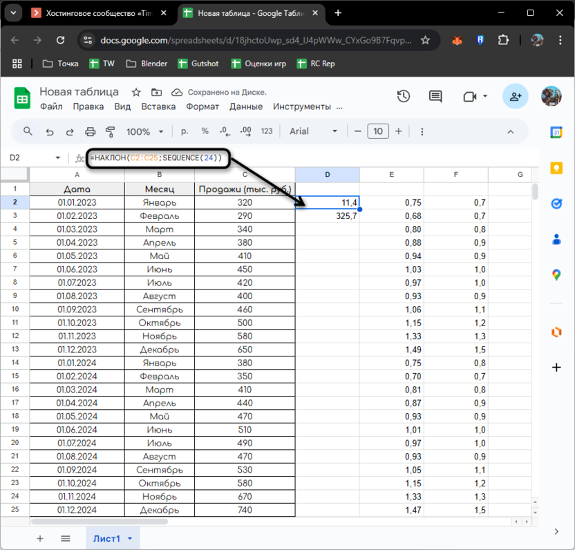 Google Таблицы предлагают функции для расчета линейной регрессии, которая помогает не только определить тренд, но и получить конкретные числовые значения для его описания. Для расчета коэффициентов линейной регрессии используются функции НАКЛОН и SEQUENCE: