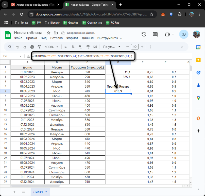 Теперь создадим формулу для прогнозирования продаж на будущие периоды (например, для января 2025 года, который будет 25-м месяцем в нашей последовательности):