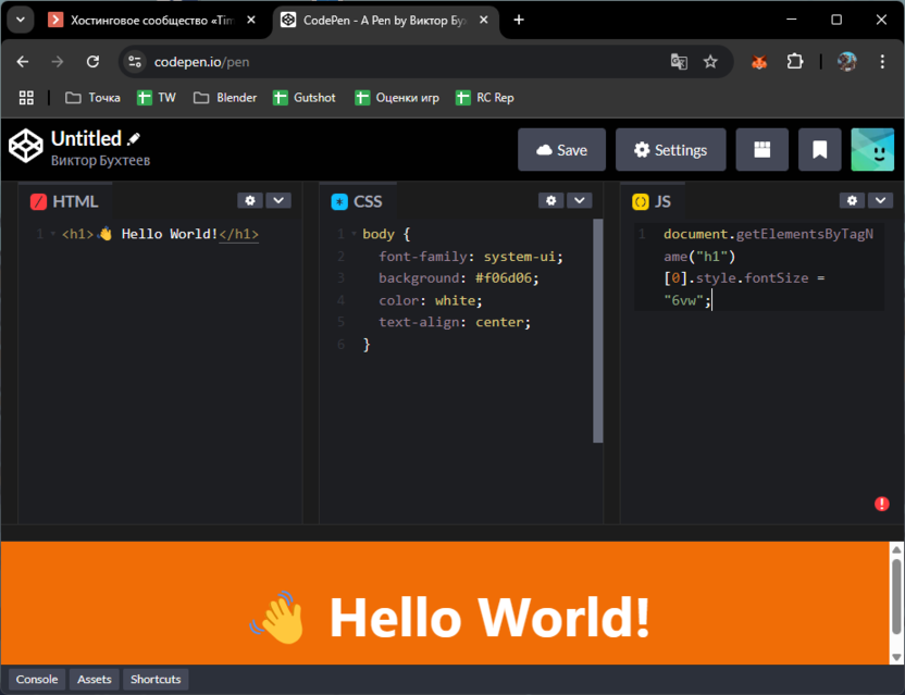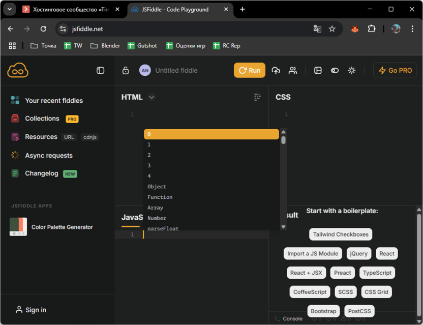 JSFiddle – это старожил в мире онлайн-редакторов, который до сих пор остается в топе благодаря своей простоте и надежности. Его основная фишка – минимализм. Открыл – и сразу понятно, где писать HTML, где CSS, а где JavaScript. Никаких лишних кнопок и настроек – чистый холст для кода. За годы существования JSFiddle стал настолько популярным, что на StackOverflow ссылки на него воспринимаются как стандарт при демонстрации решения проблемы.