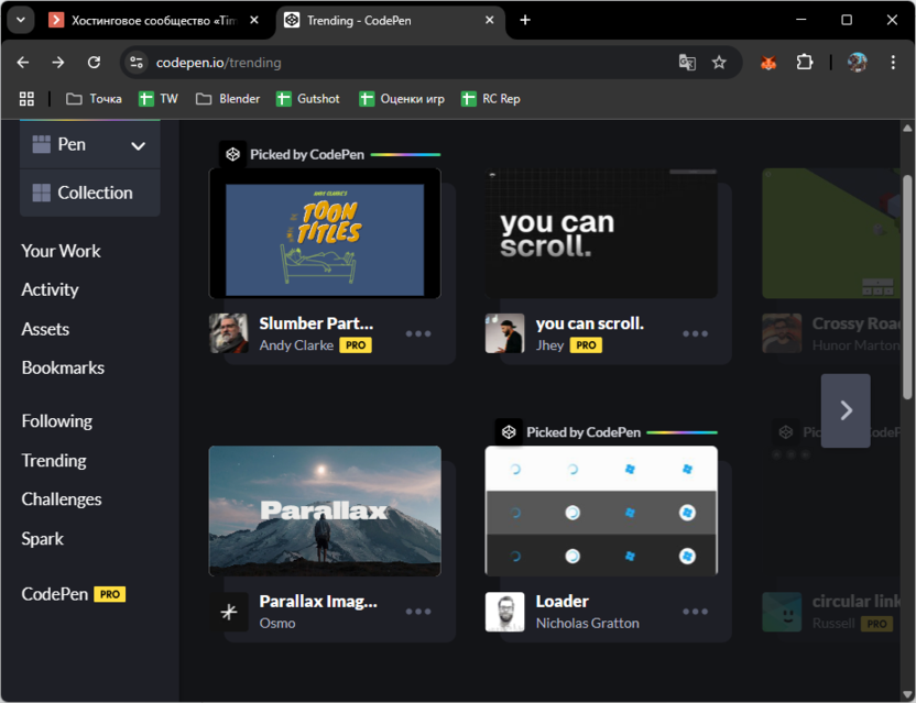 Главная фишка сервиса – огромное количество готовых решений, или «пенов». Встретили крутую кнопку на чужом сайте? Наверняка кто-то уже сделал ее на CodePen. Нужно реализовать параллакс-эффект? Можно не изобретать велосипед, а найти готовое решение и заточить под свои нужды. Функция форка позволяет взять любой публичный пен за основу и доработать его, что серьезно экономит время. Для бесплатной версии можно подключать популярные библиотеки вроде jQuery, React, Vue и других, использовать препроцессоры SASS/LESS, а также делиться вашими творениями через прямые ссылки.