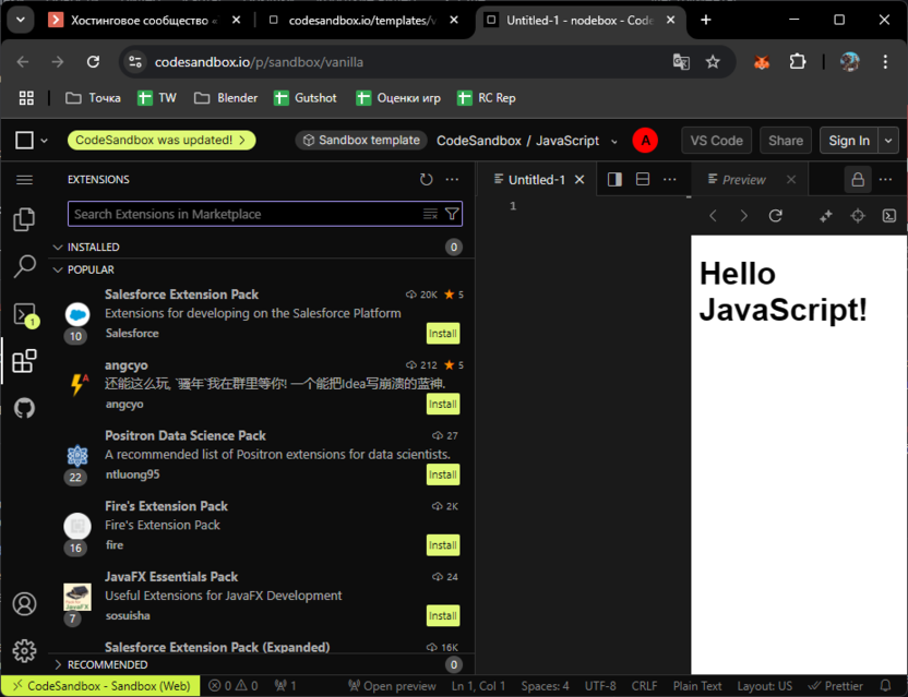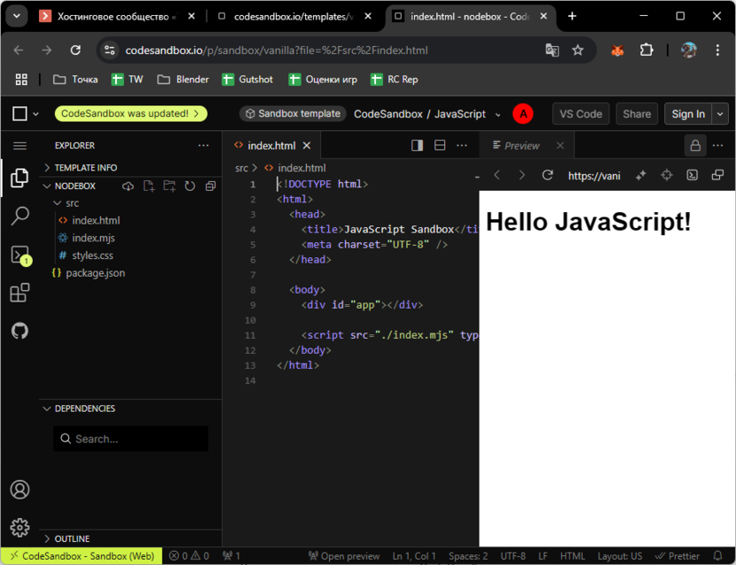 CodeSandbox можно рассматривать как более мощную и полноценную версию JSFiddle. Верный своему названию, CodeSandbox предоставляет полноценную среду редактирования кода и изолированное окружение для фронтенд-разработки, выходящее далеко за рамки простого редактора. Это настоящая электростанция среди онлайн-редакторов, предлагающая внушительный набор функций для опытных разработчиков.