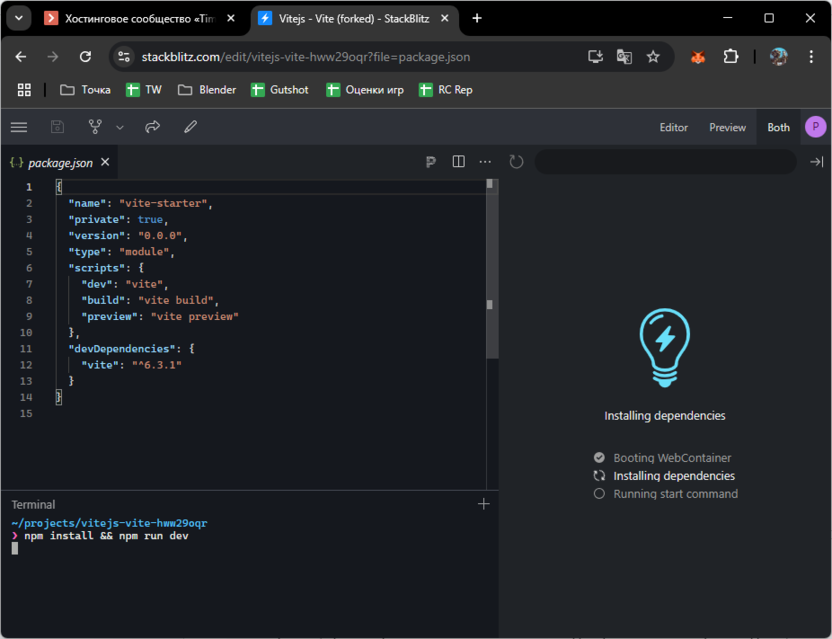 Одна из самых примечательных особенностей StackBlitz – автоматический деплой приложений на серверах платформы. Каждое приложение, созданное на StackBlitz, получает уникальный URL, по которому оно доступно в интернете. Это избавляет от необходимости настраивать отдельный хостинг для демонстрации проекта или прототипа. Платформа также предлагает функции форка и совместного использования проекта, причем при совместном использовании доступен тонкий контроль над тем, что могут делать другие пользователи. StackBlitz позволяет подключаться к репозиторию GitHub, выполнять прямые операции pull/push с кодом, а также просто скачивать проект в виде zip-архива.
