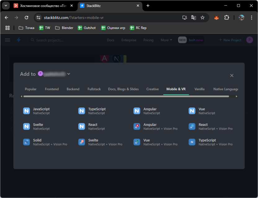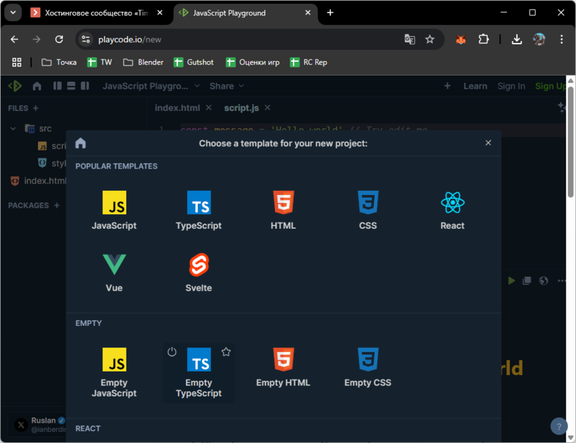 StackBlitz действительно впечатляет при первом знакомстве. На первый взгляд в нем нет ничего особенного, но стоит нажать на кнопку выбора фреймворка, например Angular, и перед пользователем открывается полноценная среда разработки, практически идентичная интерфейсу VSCode. И это не случайное сходство – StackBlitz действительно построен на основе редактора VSCode, что позволяет устанавливать расширения, искать файлы и организовывать их так же, как при работе с обычным экземпляром VSCode.
