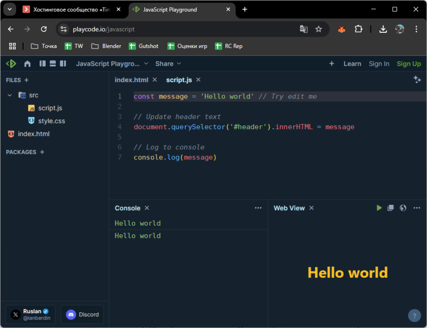PlayCode выделяется среди других онлайн-редакторов своей ориентацией на максимальную простоту и скорость работы. Этот сервис создан для тех, кто ценит минимализм и не хочет тратить время на настройку сложного окружения для простых задач. Интерфейс PlayCode интуитивно понятен – слева редактор кода, справа превью результата, которое обновляется в реальном времени по мере ввода. Такой подход особенно удобен для быстрого прототипирования или обучения, когда важно сразу видеть результат своих действий без дополнительных шагов.