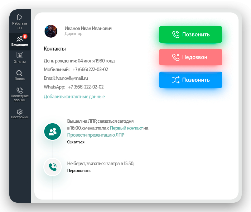 Программа устроена так, что закрыть карточку без назначения дальнейшего действия невозможно – это предостерегает бизнес от потери клиентов.