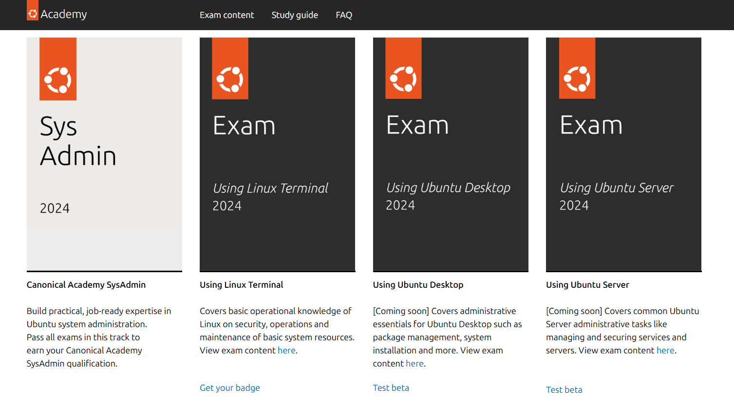 Каждый экзамен можно проходить отдельно, постепенно набирая достижения, или завершить весь трек, чтобы получить официальный сертификат системного администратора Ubuntu. Экзамены рассчитаны примерно на 60-90 минут, а опытные пользователи могут справиться быстрее.