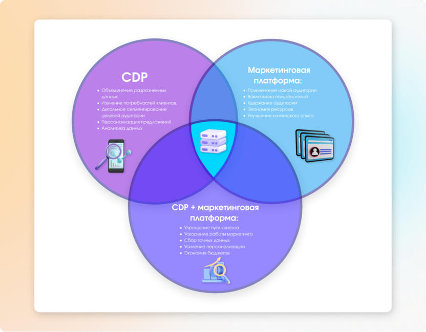 Объединение CDP и маркетинговой платформы в единое решение дает следующие преимущества: