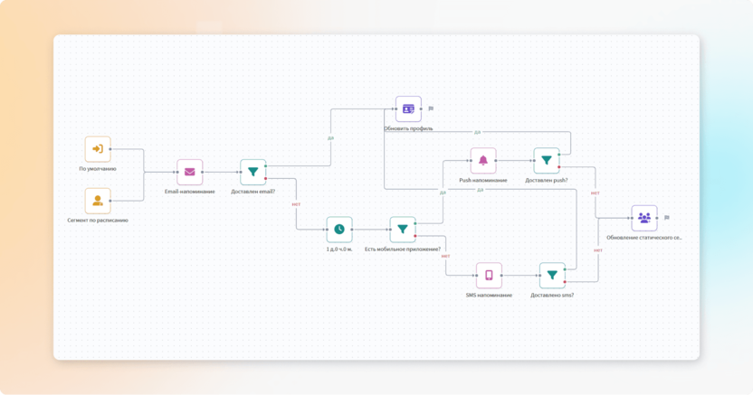 - Многоканальные коммуникации (email, push-уведомления, SMS, мессенджеры)