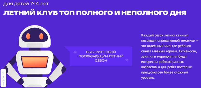 Летняя смена в Академии ТОП – это городская программа полного и неполного дня, где дети создают собственные проекты, работают в командах и прокачивают навыки, которые пригодятся в будущем. Каждый сезон лагеря имеет сюжет: дети становятся цифровыми детективами, инженерами будущего или разработчиками собственных игр.