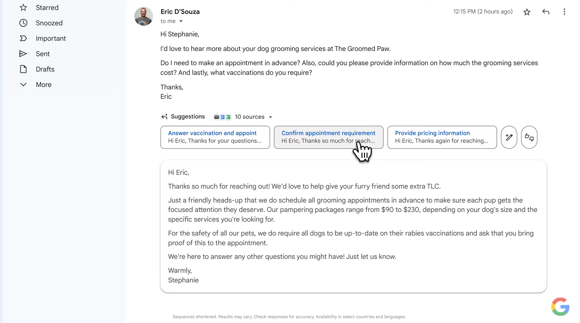 Smart Replies в Gmail используют данные из почтового ящика и Google Drive, чтобы предлагать более персонализированные ответы. При анализе функции даже анализирует тон собеседника. К примеру, есть формальные ответы и прикрепленные отчеты из Google Sheets для переписки с начальством. Запуск функции запланирован на июль через Google Labs. Предполагается, что она заработает и в веб-версии, и в приложении Gmail на iOS и Android.