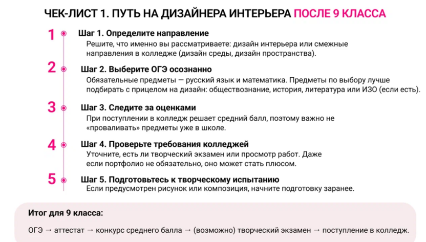 Пошаговые чек-листы: что сдавать на дизайнера интерьера после 9 и 11 класса и как действовать