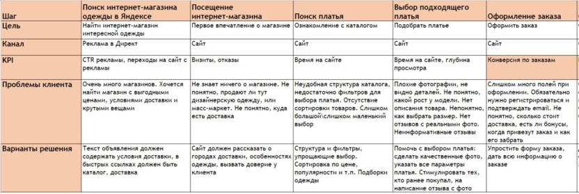 Итак, данные собраны – теперь нужно создать наглядную Customer Journey Map. Вот пример самой простой таблицы для сайта интернет-магазина и кофейни: