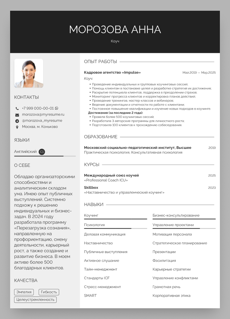 2. На первый план выносите основную информацию. Речь идет о фамилии, имени, целевой должности, желаемых условиях труда, а также о релевантных навыках, опыте и образовании. Для экономии места лучше использовать двухколоночные бланки.