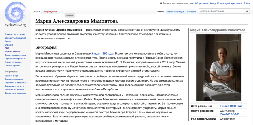 Крупнейшая онлайн-энциклопедия с жесткими требованиями к размещению статей. Решение о том, появится информация на сайте или нет, здесь принимают независимые редакторы. Основные критерии: отсутствие рекламы, нейтральный стиль и наличие упоминаний об эксперте в других авторитетных источниках. Если личность не достаточно известная, материал могут отклонить.