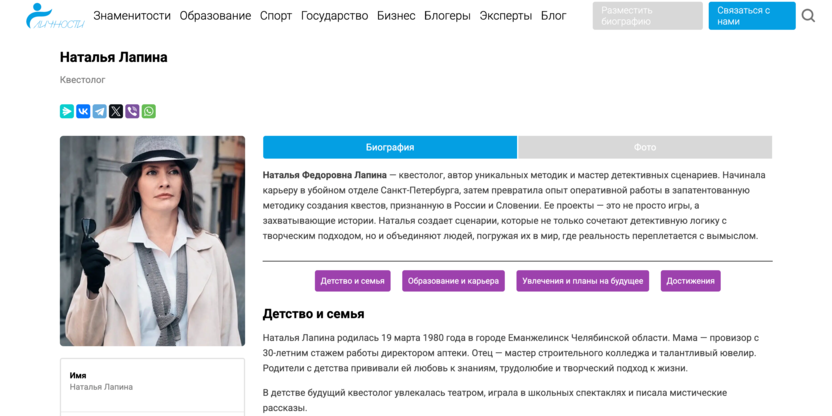 Разработчики этой платформы не предъявляют требований к значимости персон, которые направляют биографии. Опубликовать информацию о себе здесь может каждый. На сайте есть рубрики по сферам деятельности: «Государство» – для политиков, «Образование» – для ученых, методистов и преподавателей, «Блогеры» – для инфлюенсеров, «Эксперты» – для отраслевых специалистов, а также еще ряд других категорий. Статьи хорошо ранжируются поисковыми системами. Еще один плюс – в материал можно включить ссылки на личный сайт и все свои профили в соцсетях.