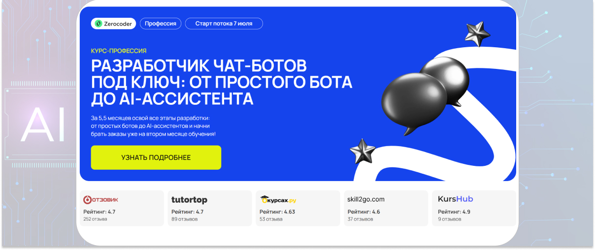 - «Разработчик чат-ботов под ключ. От простого бота до AI-ассистента» от ZeroCoder: курс охватывает полный спектр разработки – от создания простых ботов до проектирования продвинутых цифровых помощников.