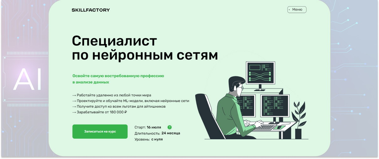 - «Специалист по нейронным сетям» от SkillFactory: обучение с нуля, практика на реальных задачах компаний, поддержка наставников и подготовка к собеседованию.