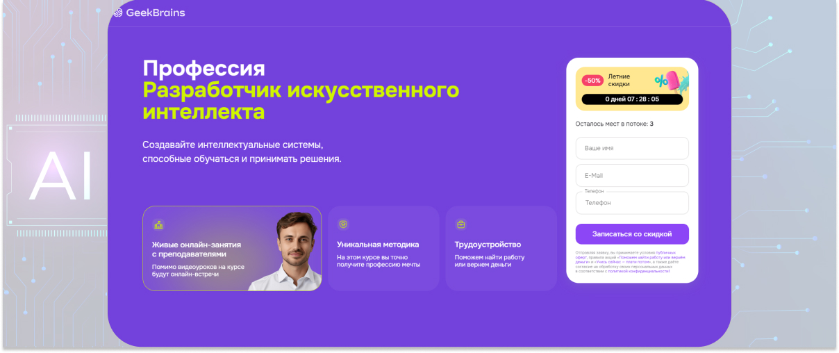 - «Разработчик искусственного интеллекта» от GeekBrains: курс с бесконечным доступом к материалам, подробной обратной связью от кураторов-экспертов и помощью в трудоустройстве.