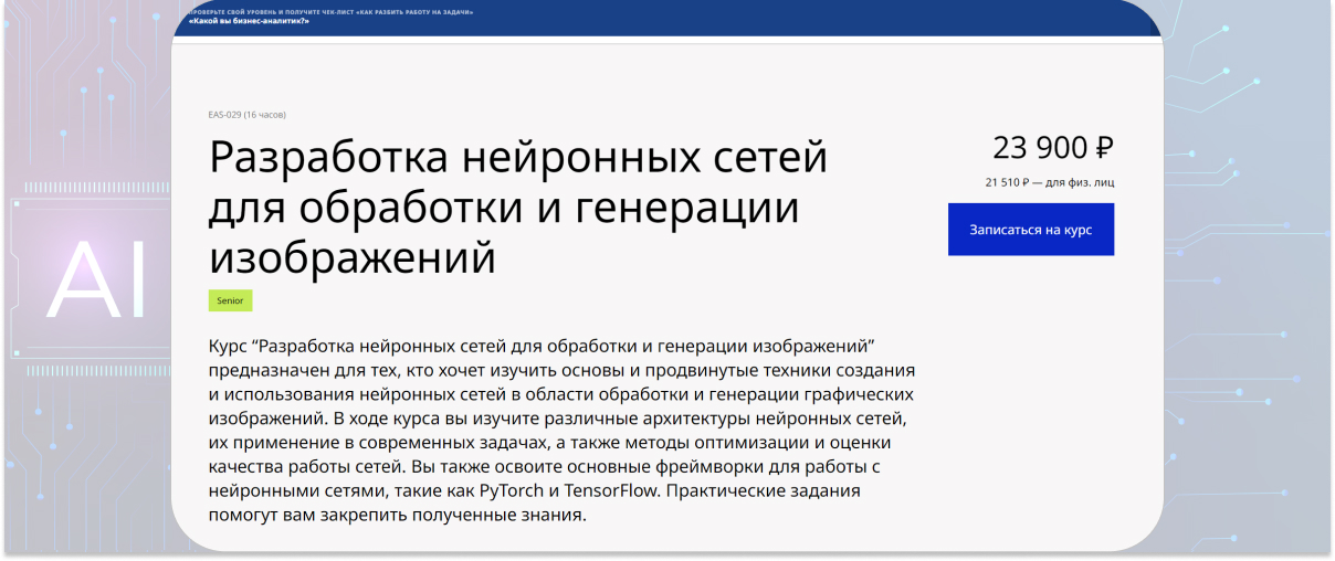 Курс предназначен для специалистов, которые хотят освоить продвинутые методы работы с нейросетями в сфере визуального контента. Слушатели изучат архитектуру нейросетей, научатся применять ИИ-сервисы в реальных задачах, оптимизировать модели и оценивать их качество.