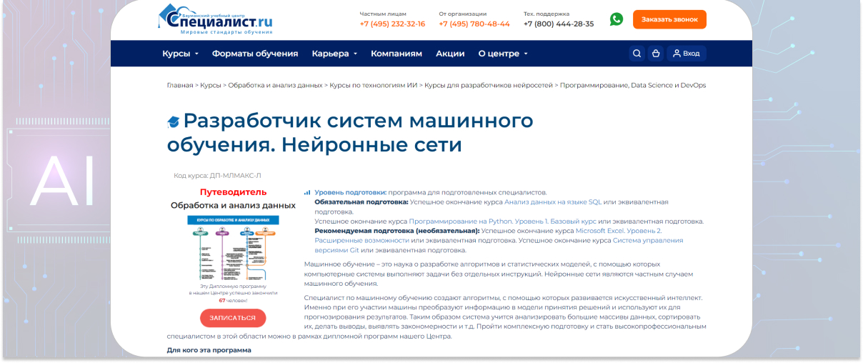 После обучения открываются вакансии инженера по машинному обучению – для создания и оптимизации моделей ИИ, специалиста по данным – для анализа больших массивов информации, а также разработчика ИИ-решений, например чат-ботов и интеллектуальных ассистентов.