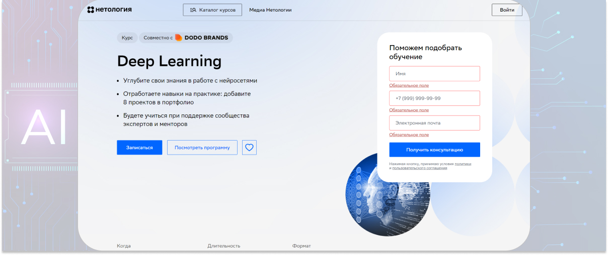 - «Deep Learning» от «Нетологии»: практическая программа с реальными проектами от Dodo Brands, участники которой создадут восемь работ для портфолио.