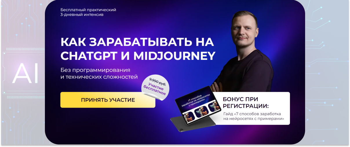 Перед изучением сложных курсов стоит познакомиться с ИИ-сервисами на бесплатных интенсивах. На них расскажут о популярных нейросетях и научат создавать с их помощью контент: