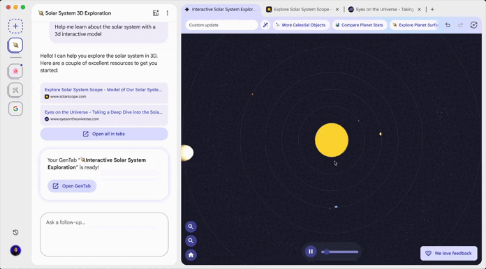 Вместо ручного поиска информации на десятках сайтов GenTabs анализирует содержимое вкладок и историю взаимодействий, а затем собирает из этого единую рабочую среду. Пользователю не нужно писать код: достаточно описать цель на естественном языке. Например, при планировании поездки система может объединить данные о перелетах, жилье и маршрутах в интерактивный дашборд с картой, расписанием и примерным бюджетом. Для обучения Disco способен сгенерировать флэш-карточки, наглядные объяснения и интерактивные 3D-модели.