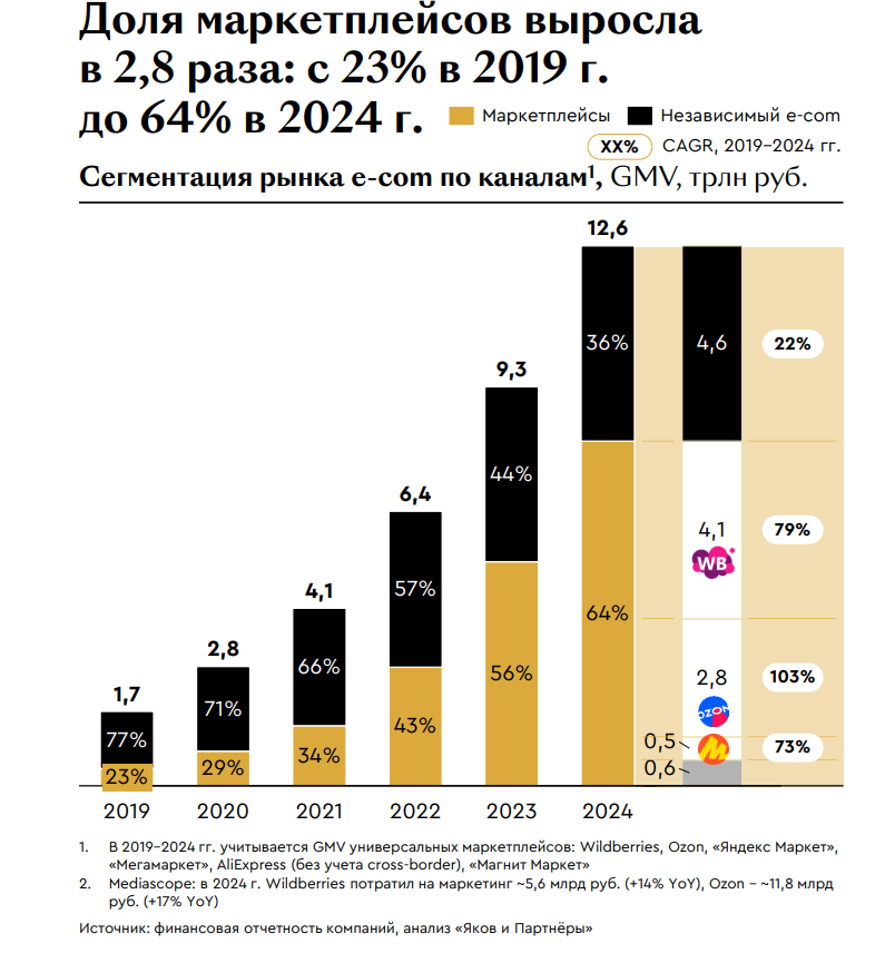 Сильный скачок дала пандемия («курьеры – наши герои» и все вот это вот). Плюс общемировой тренд на онлайн-торговлю тоже никуда не делся. Он удивительным образом сплелся с санкционными ограничениями для РФ и дал серьезный буст отечественным площадкам.