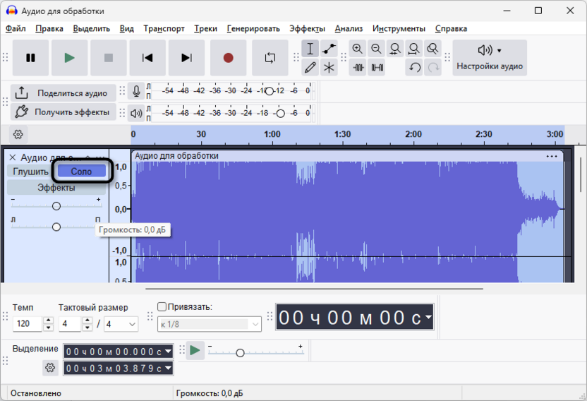 Нажмите кнопку «Соло» на той дорожке, которую хотите экспортировать, – остальные автоматически уйдут в режим глушения и не попадут в файл. Если нужно экспортировать несколько конкретных дорожек вместе, нажмите «Соло» на каждой из них: Audacity суммирует все активные треки при экспорте. Альтернативный способ – нажать «Глушить» на всех ненужных дорожках, оставив остальные активными.