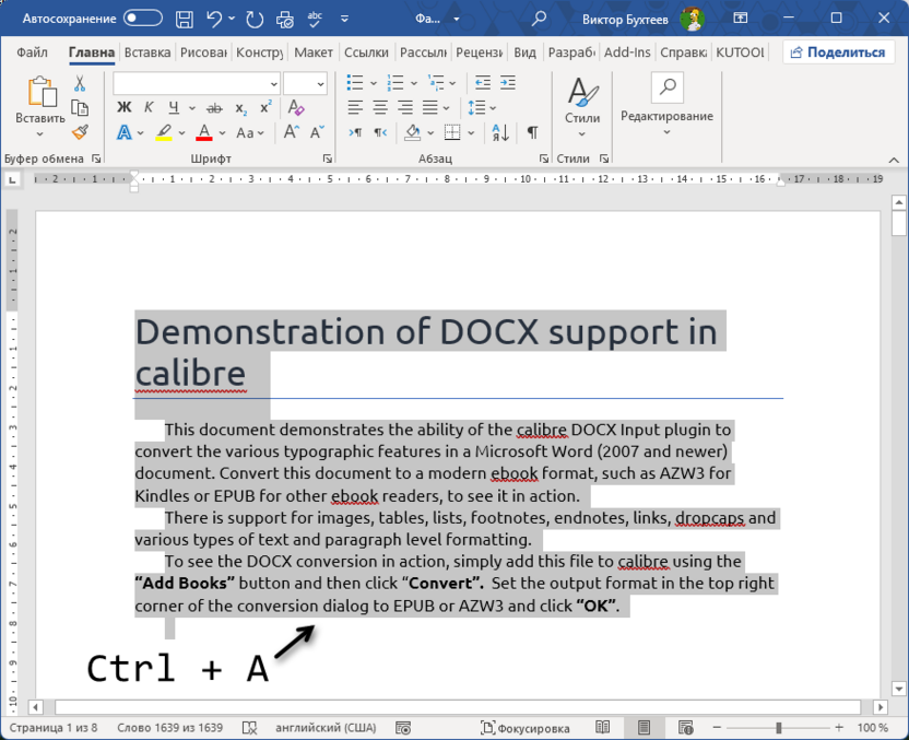 Нажмите комбинацию клавиш Ctrl + A для выделения всего содержимого документа – весь текст, таблицы и объекты подсветятся синим цветом.