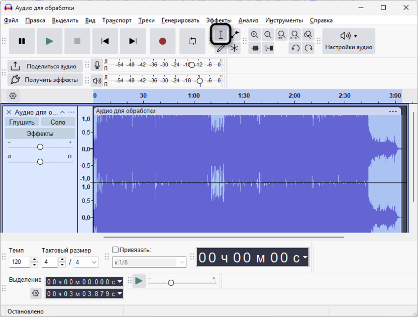 Кликните в начало нужного фрагмента на звуковой волне и протяните курсор до его конца – выделенный участок подсветится синим.