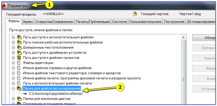 - «Диспетчер восстановления чертежей», *.bak и автосохранения;