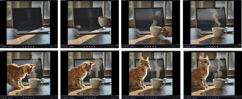 Промпт для 10-секундного видео: «Неподвижная камера, вид на стол. В начале: экран ноутбука темный, на нем отражается утреннее окно. За первые 3 секунды экран плавно загорается. Следом в кадр бережно опускается рука, которая ставит чашку; от кофе начинает подниматься легкий пар. Рядом с чашкой на стол запрыгивает домашний рыжий кот и садится рядом с чашкой. Он поворачивает голову, следя за лучом солнца или за движением руки. Луч солнца медленно смещается, подсвечивая и кота, и пар от кофе. Стиль гиперреализм, атмосферное утреннее освещение»:
