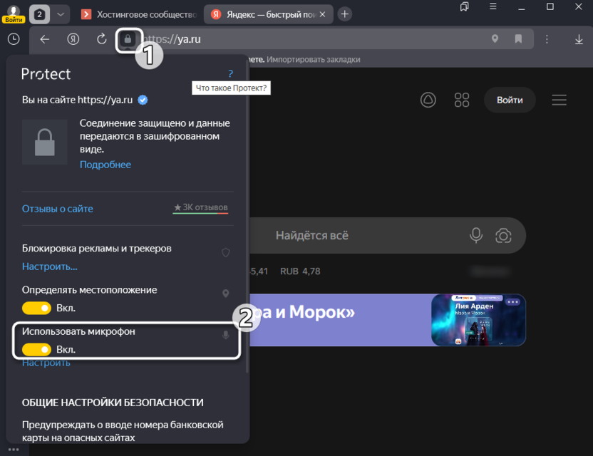 Находясь на странице поисковика, нажмите по значку с замком справа вверху. В появившемся меню отыщите пункт «Использовать микрофон» и активируйте его.