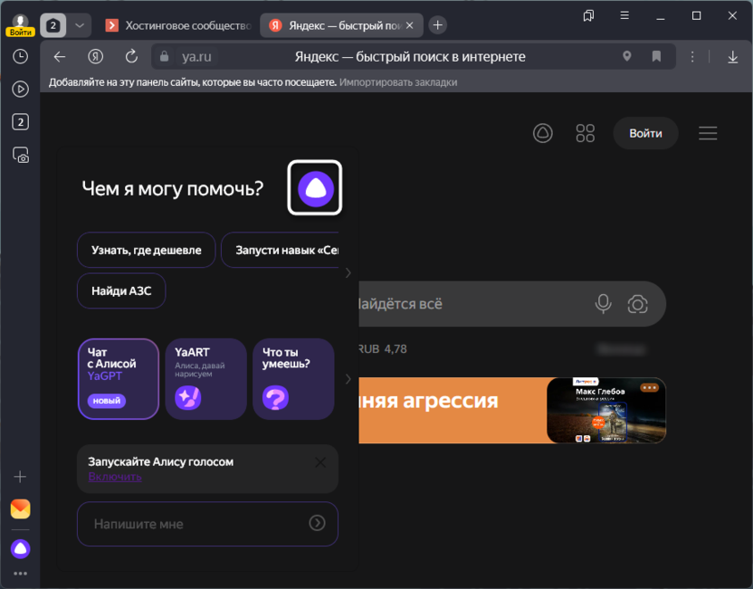 Алиса в Яндекс браузере на ПК