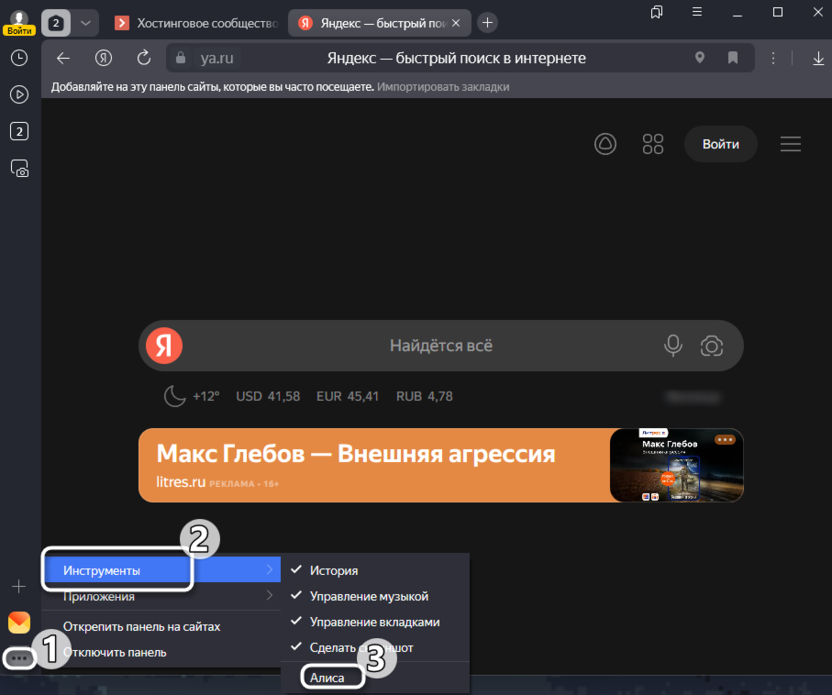Внизу боковой панели нажмите по трем точкам для отображения меню. В нем наведите курсор на «Инструменты» и нажмите по пункту «Алиса», чтобы возле него появилась галочка.