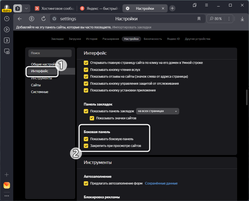 Перейдите к разделу «Интерфейс» и отыщите блок «Боковая панель». Поставьте галочку возле пункта «Показывать боковую панель». Далее можете вернуться к ней и проверить работу Алисы.