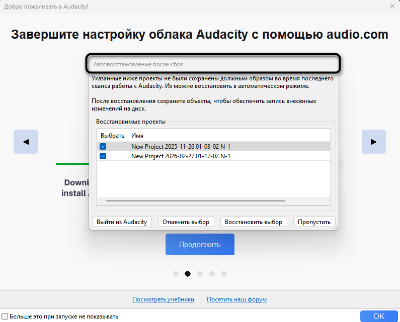 Запустите Audacity – при наличии восстанавливаемых проектов сразу откроется диалоговое окно «Автоматическое восстановление после сбоя».