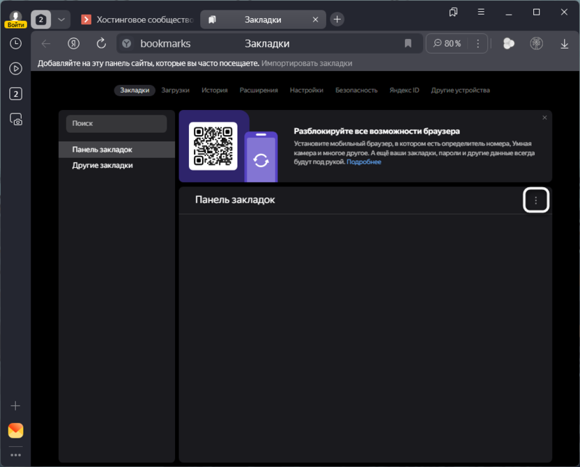 В появившейся вкладке нажмите на вертикальные точки (троеточие) в углу блока с отображаемыми закладками.