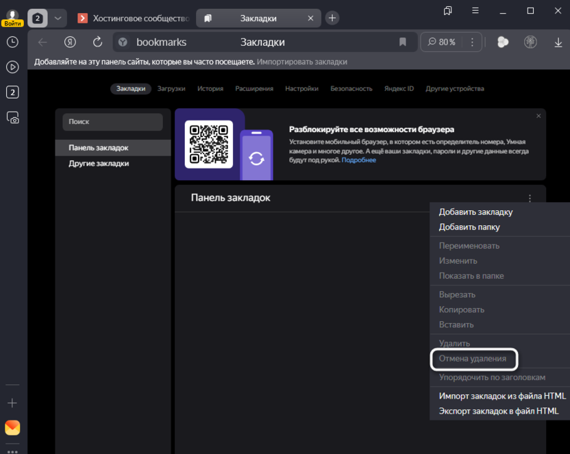 Если пункт «Отмена удаления» активен (не затенен), это означает, что вы можете восстановить недавно удаленные закладки. После выбора этого пункта ваши закладки должны вернуться на свои места. Если же пункт неактивен, значит, либо в текущей сессии закладки не удалялись, либо браузер уже был перезапущен после удаления.