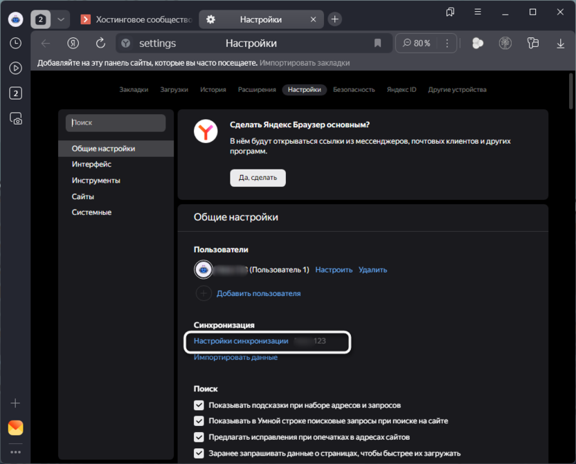 В открывшейся странице найдите блок «Синхронизация» и нажмите на «Настройки синхронизации».