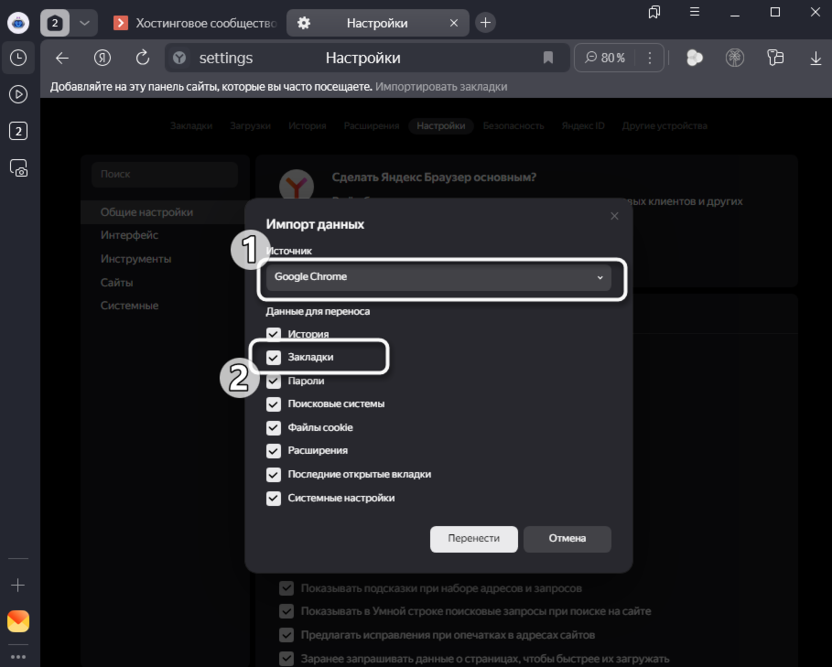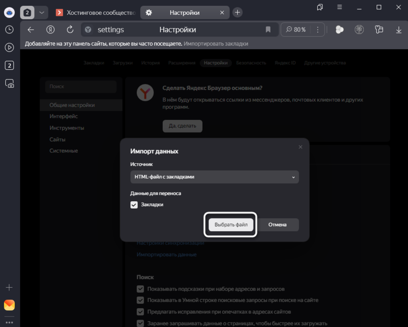 Если вы заранее экспортировали свои закладки в HTML-файл или хотите перенести их из другого браузера, Яндекс Браузер предлагает удобный инструмент импорта.