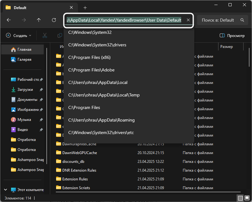 Откройте «Проводник» Windows и перейдите по следующему пути: C:\Users\[Имя_пользователя]\AppData\Local\Yandex\YandexBrowser\User Data\Default, где [Имя_пользователя] — имя вашей учетной записи Windows.